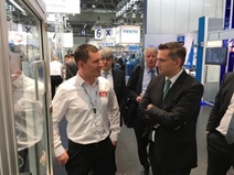Auch hochrangige Politiker aus Deutschland und dem Ausland waren auf der Industriemesse zu Gast. So stattete der Sächsische Staatsminister für Wirtschaft, Arbeit und Verkehr Martin Dulig auch unserem Stand einen Besuch ab und ließ sich von unserem jungen Geschäftsführer Martin Schüller gern die Funktionsweise unseres Messemodells erklären.