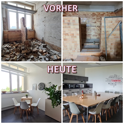Wo früher die Monteure geduscht haben steht bald eine moderne Küche mit genug Sitzplätzen für eine entspannte Mittagspause mit den Kollegen oder ein kleines Meeting mit unseren Partnern und Kunden.
